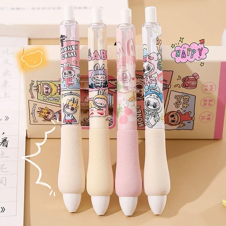 A set of four cute gel pens featuring Labubu cartoon designs will delight children and students who enjoy original and playful school stationery. The pens have a soft ergonomic grip and high-quality black ink that dries quickly and does not smudge. Ideal for school, for notes, and as a gift.