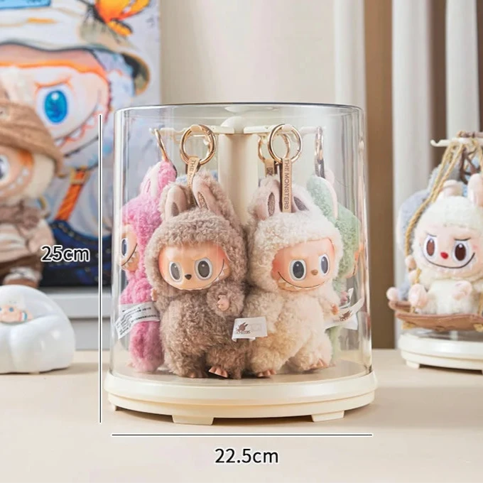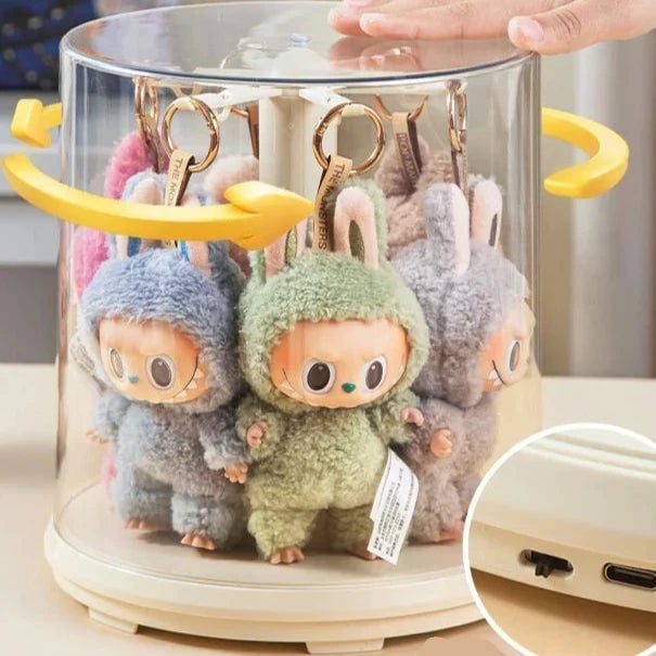 A modern display box that lets you stylishly display your figurines, plush toys or keychains while protecting them from dust. Thanks to its transparent design and rotating mechanism, you can view your collectibles from all angles.