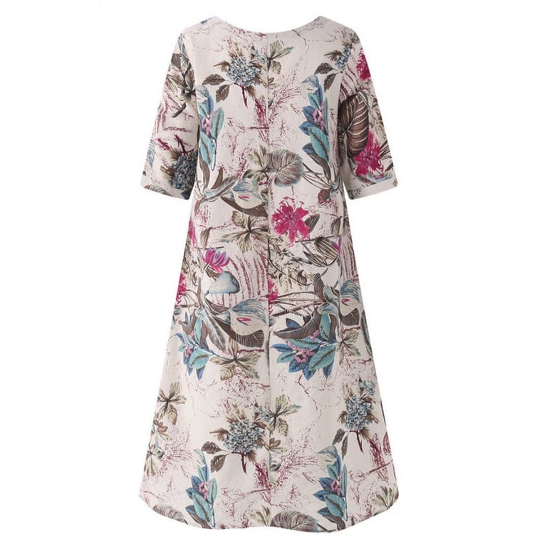 Women's loosely cut asymmetric dress with a longer skirt and short flared sleeves. Round neckline. Lightweight airy material. Colourful print with a floral pattern. Plus size available. Available in two variants.