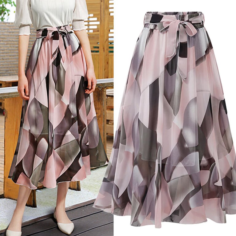 Women's airy skirt with a high waist and a tie belt. Long loose fit with a colourful print. Available in two variants.