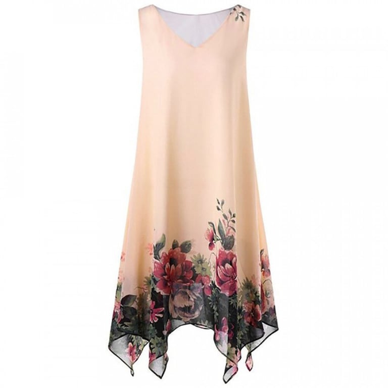 Women's sleeveless tunic with a subtle V-neckline. Loose asymmetric cut. Lightweight airy material with a floral print. Plus size available. Choose from multiple options.