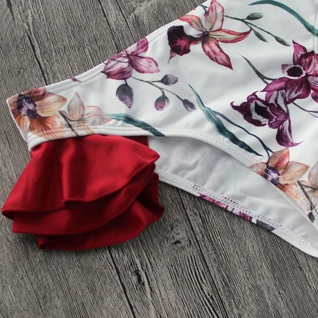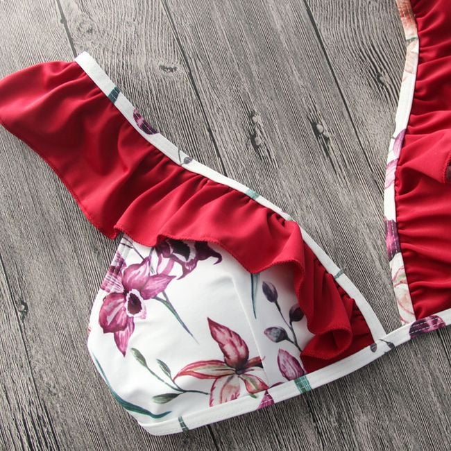 Women's bikini with a summer floral motif is trimmed with beautiful red ruffles.