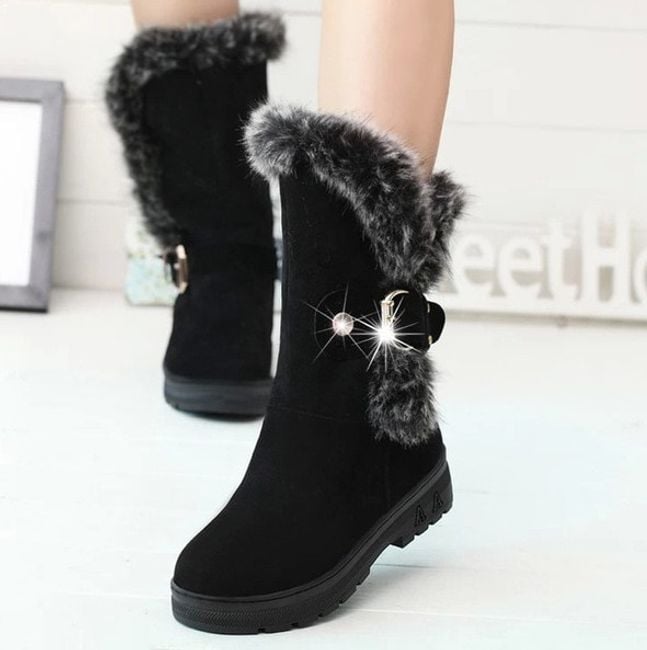 Stylish ankle boots are adorned with fur and a buckle. Available in three colours.
