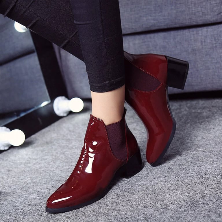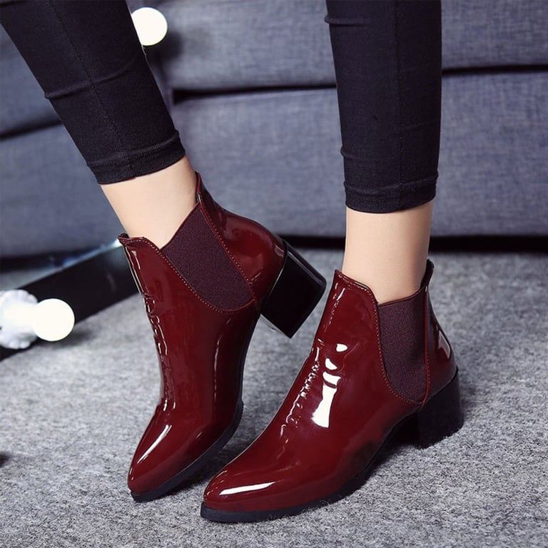 Women's ankle boots with a wide low heel. The boots have a glossy leather-like surface. Slip-on style with a tapered toe and side elastic elements. Available in two colours.