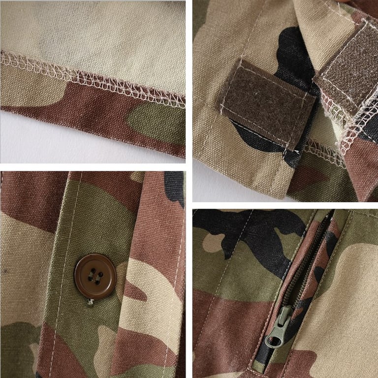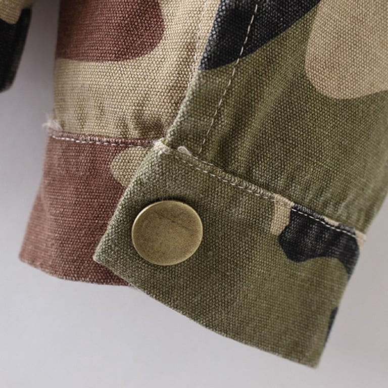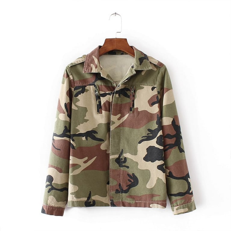 Women's lightweight denim jacket. Print with a green army pattern. The jacket features a collar and button fastening. Long roll-up sleeves. Two chest pockets.