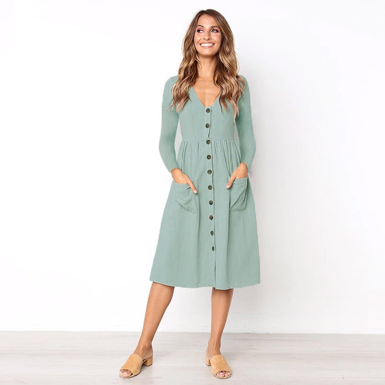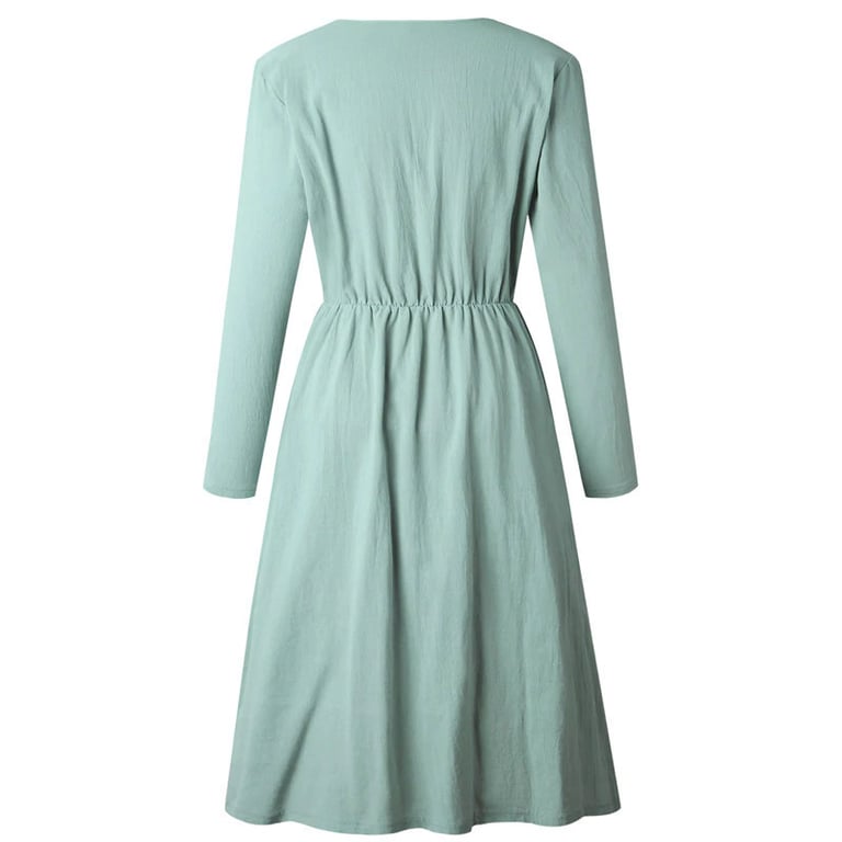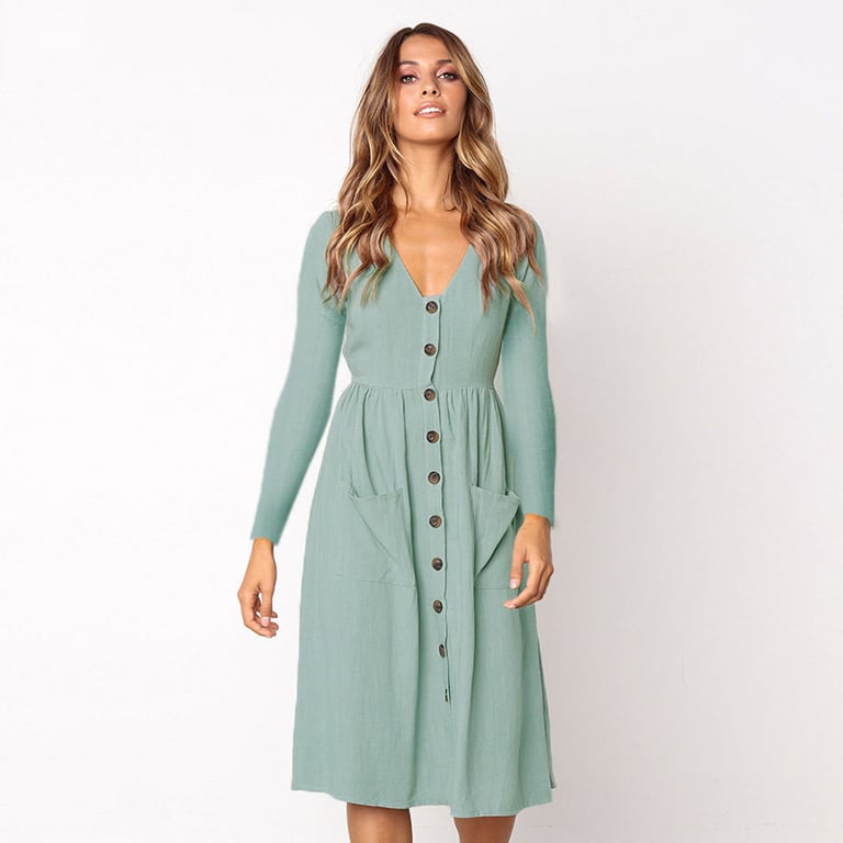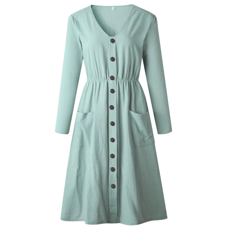 Women's autumn dress with long sleeves and a V-neck. The dress features a knee-length skirt and button fastening. Available in various colour options.