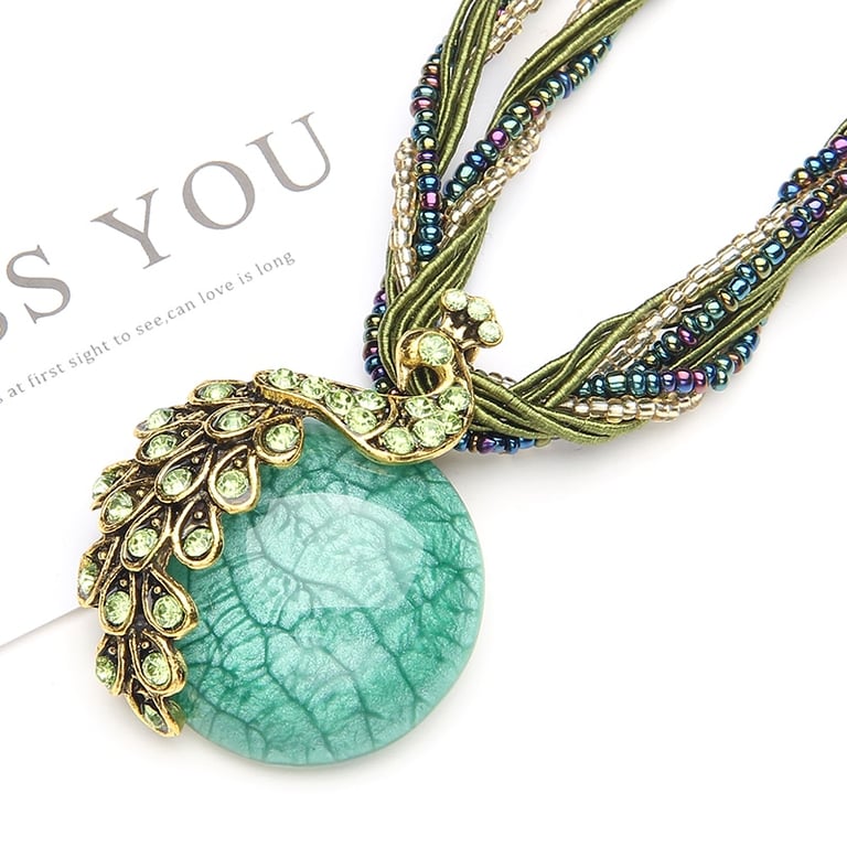 Women's beaded necklace with a peacock.