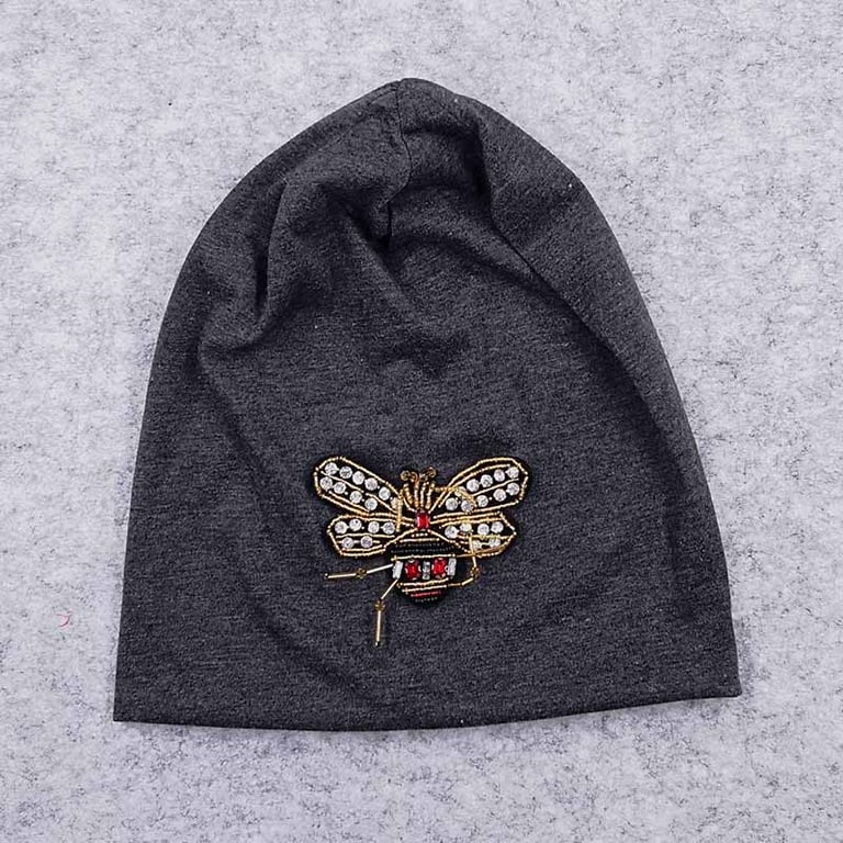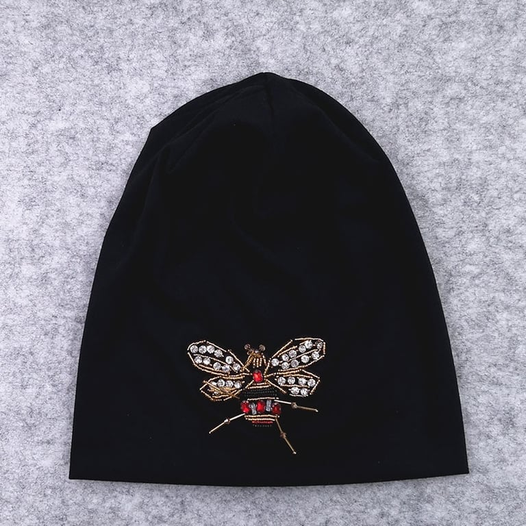 A lighter women's hat with a bee embroidered from beads.