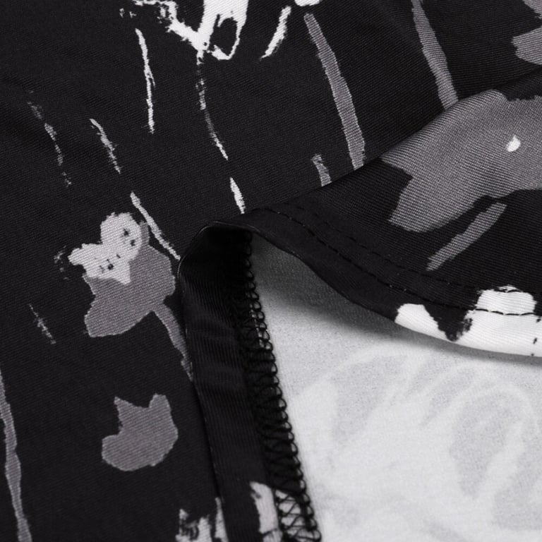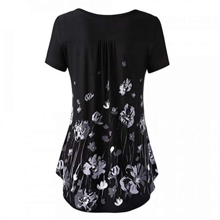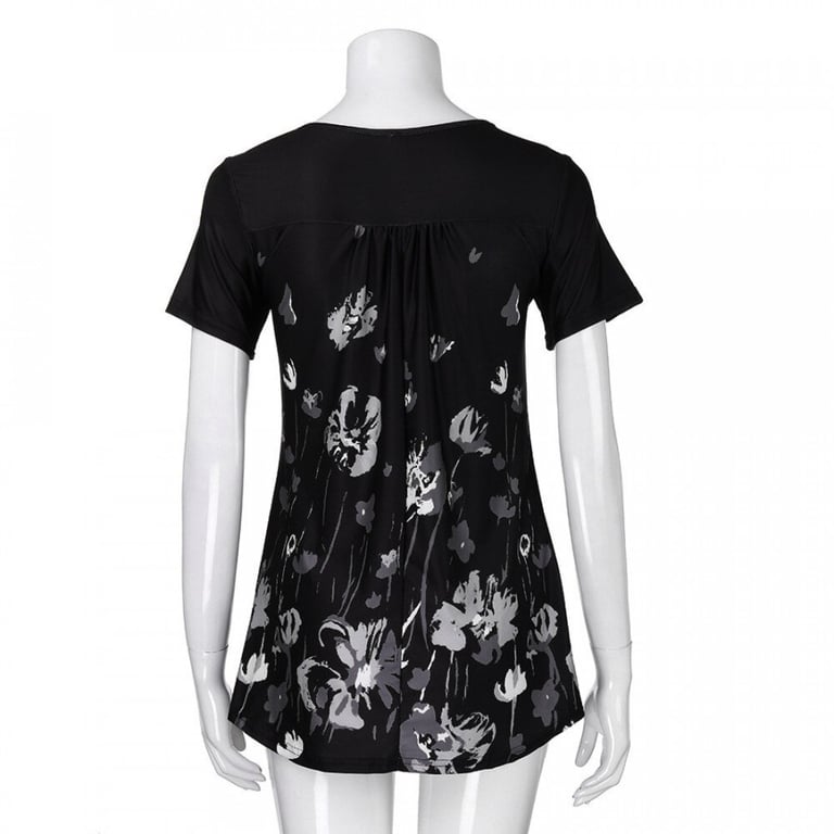 Women's blouse with short sleeves and a round neckline. Loose longer fit with gathering and buttons. Floral pattern.