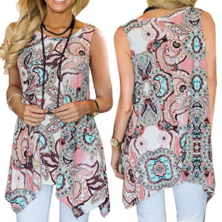 Women's sleeveless blouse. Loose long cut with a round neckline. Print with a colourful pattern. Available in two variants.