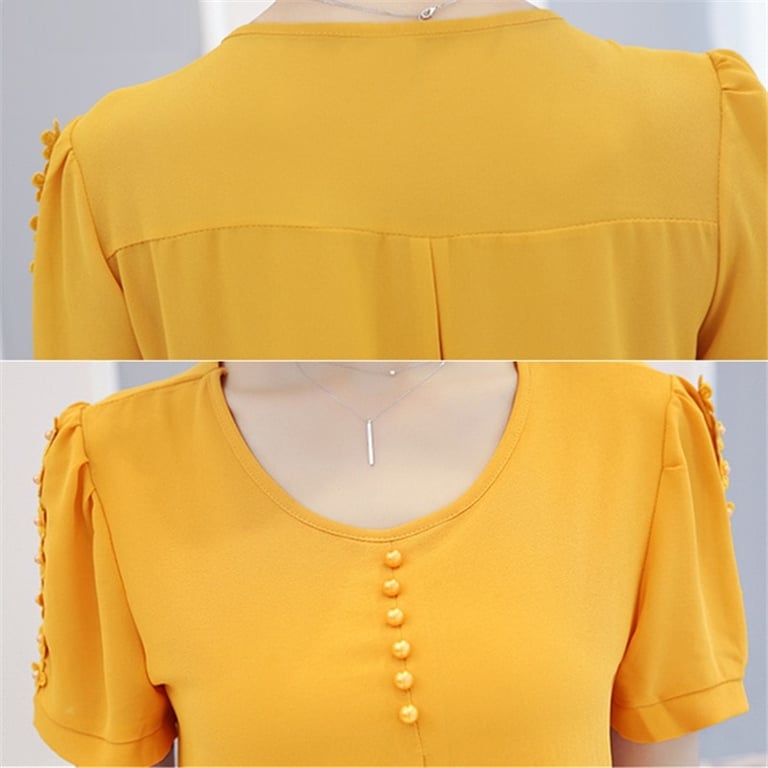 It features short sleeves adorned with sewn-on flowers.