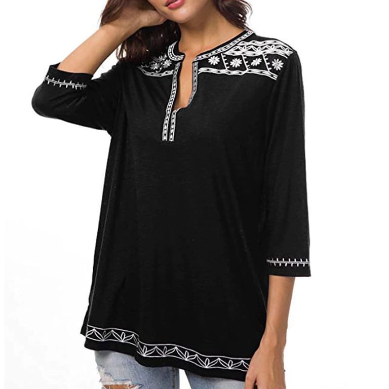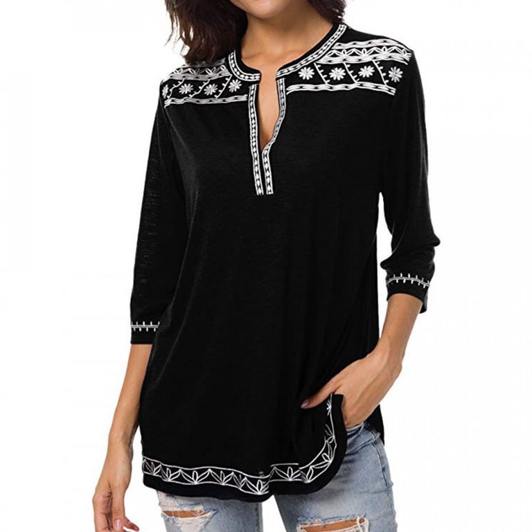 Women's blouse with 3/4 sleeves. V-neckline and sleeves are adorned with subtle white embroidery. Available in three colour options.