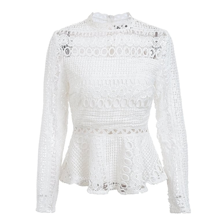 Elegant blouse with long sleeves and perforations throughout.