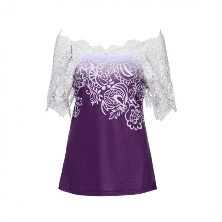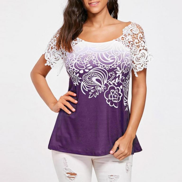 Women's blouse with a round neckline and short sleeves adorned with lace. Printed on the front. Lace detail on the back. Available in several colours.