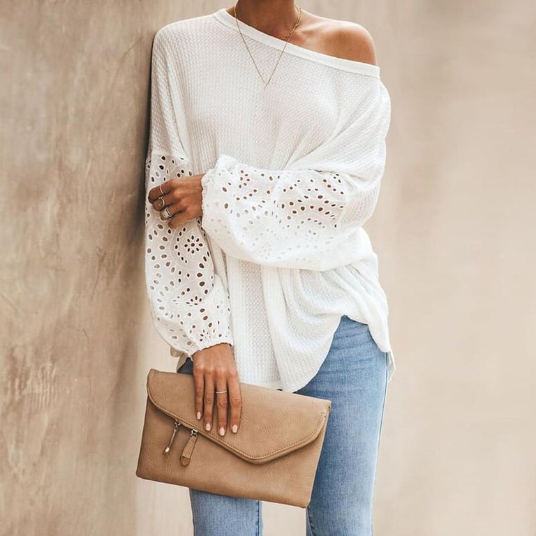 Women's blouse with wide balloon sleeves and lace decoration. The blouse has a loose oversized fit with a dropped shoulder neckline.