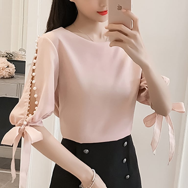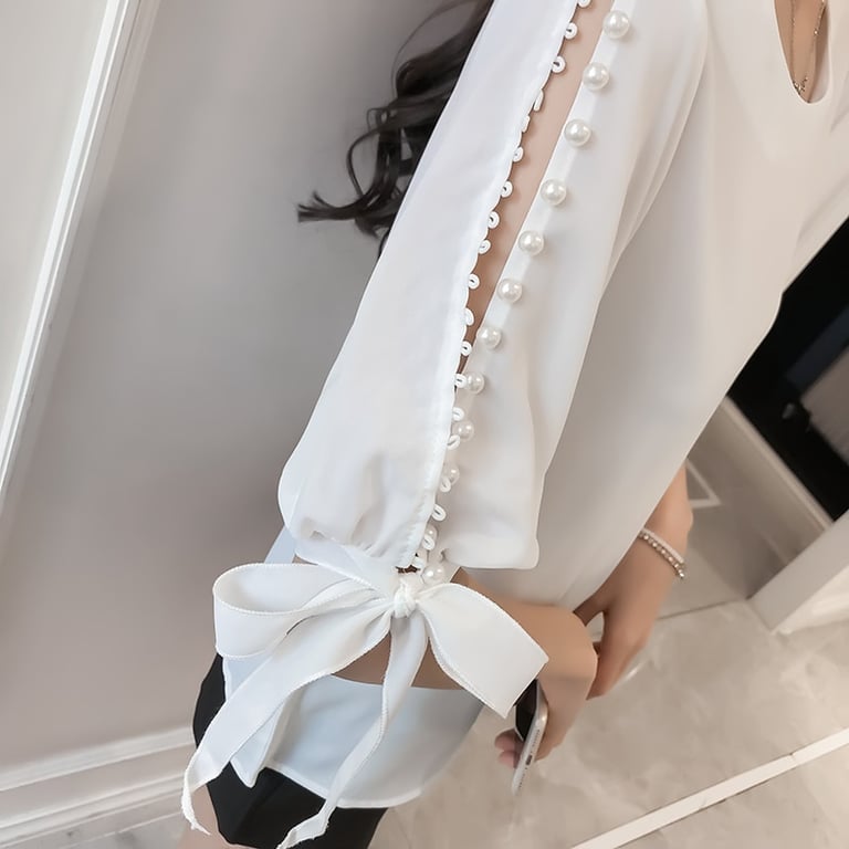 It has shorter sleeves that are perforated and adorned with pearls and bows.