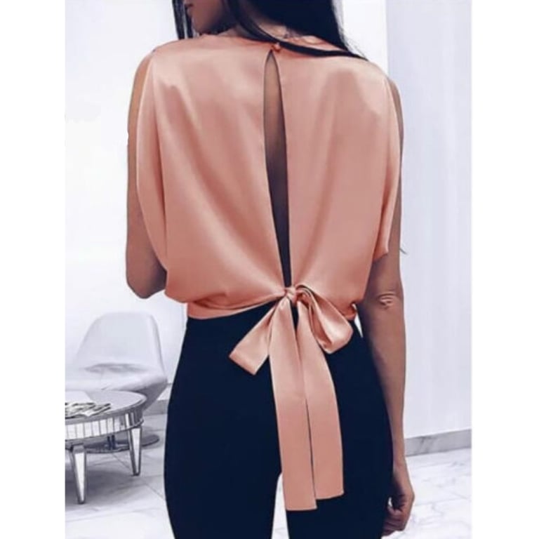 The back is slightly cut out in the middle and features a large bow at the end.