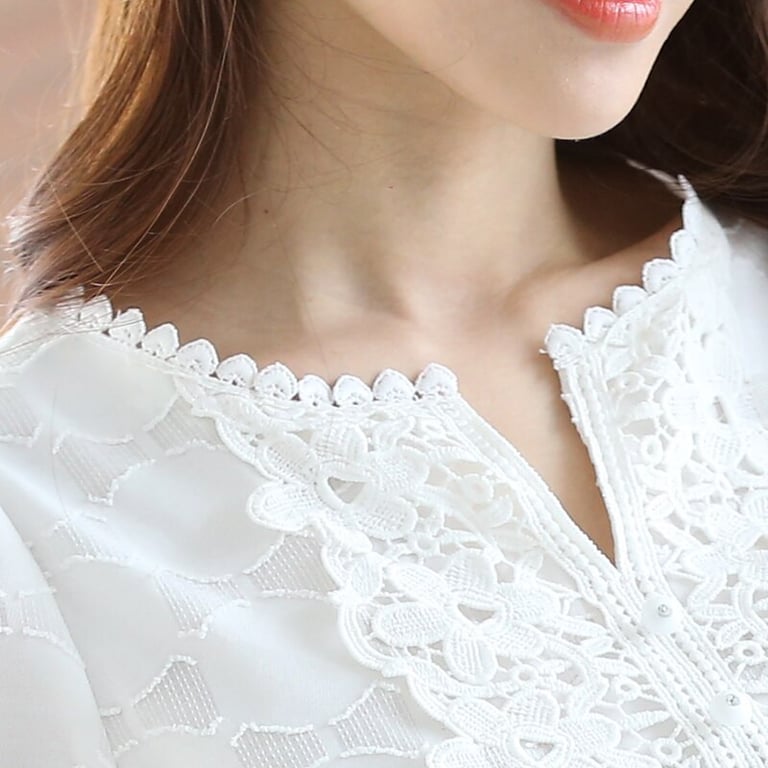 Women's blouse with long sleeves and a round neckline. Lace detailing. Comfortable loose fit.