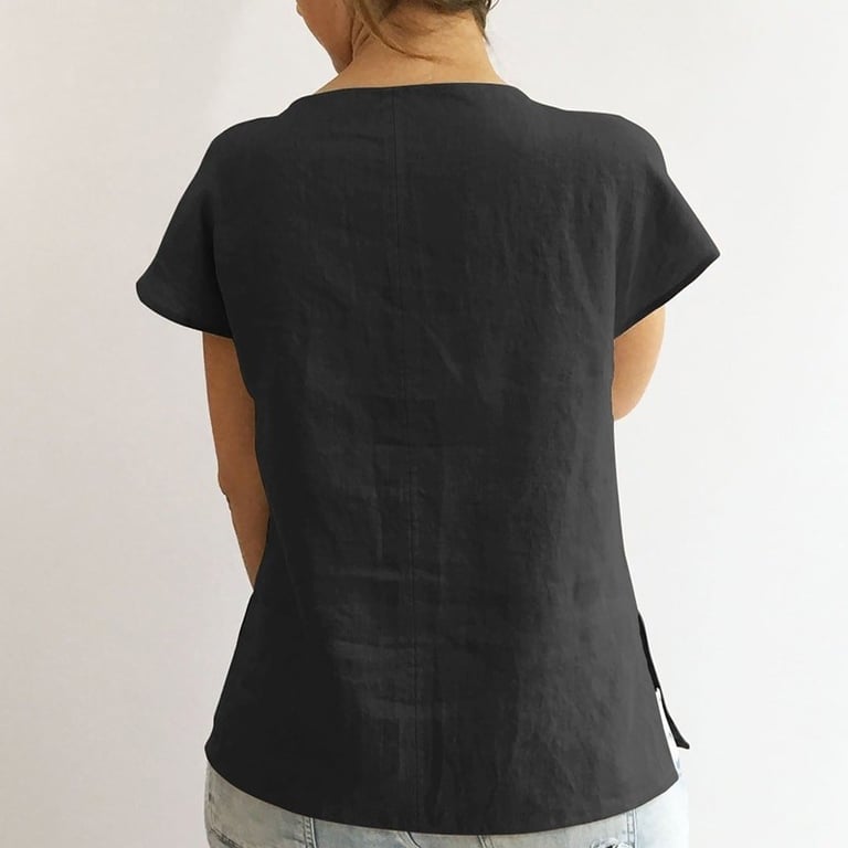 The blouse has short sleeves and is solid-coloured.