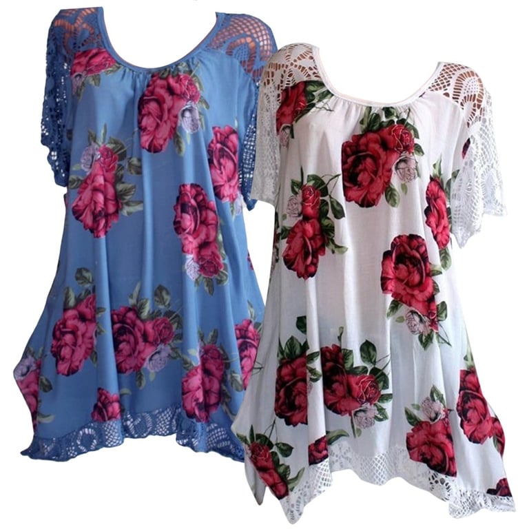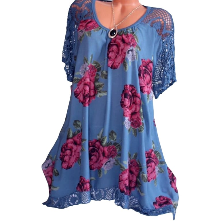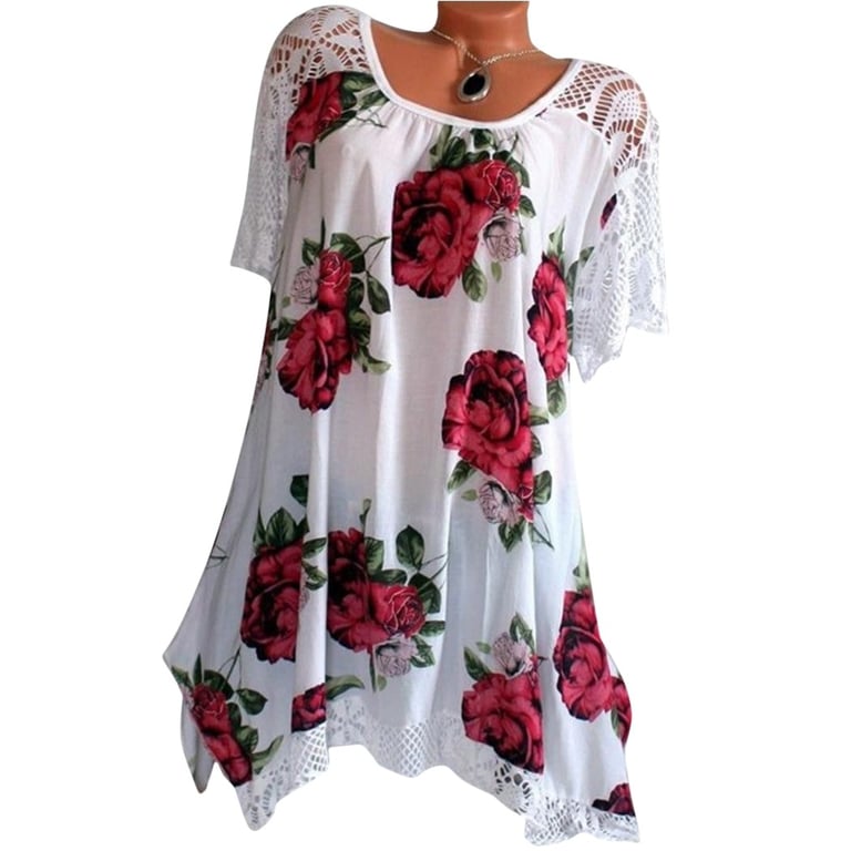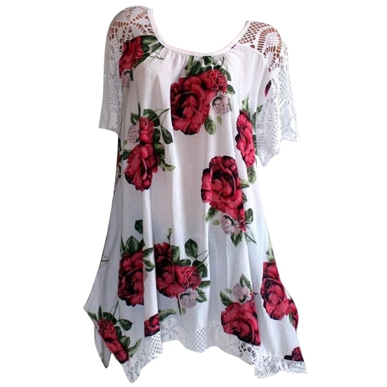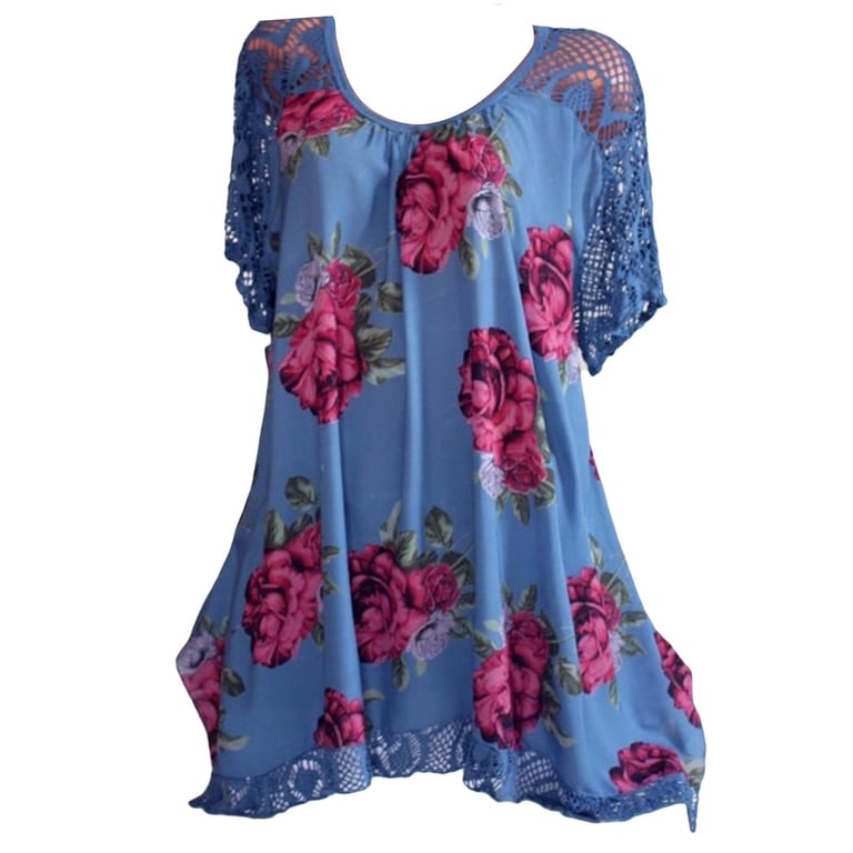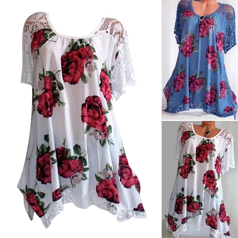 It features a floral print and lace sleeves.