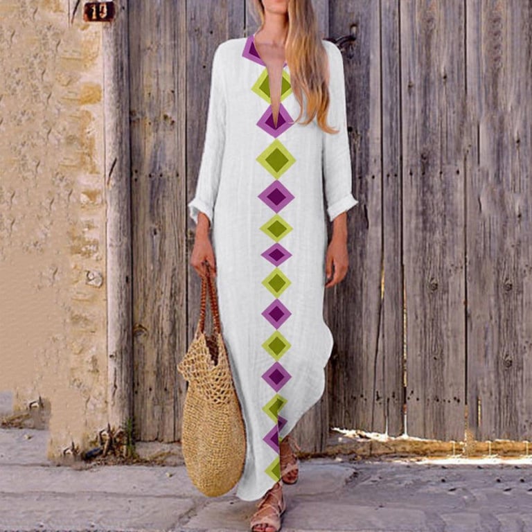 Women's long tunic dress with long sleeves. The dress features a V-neckline with a collar. Lightweight airy material. Colourful print in boho style.