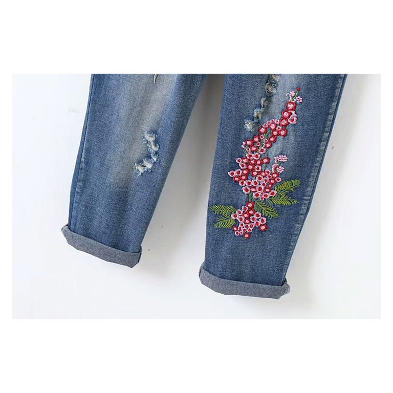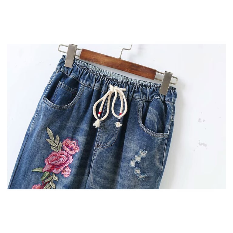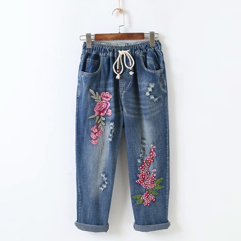 Women's boyfriend style jeans. Elastic waistband. Low rise. Wider legs with floral embroidery.