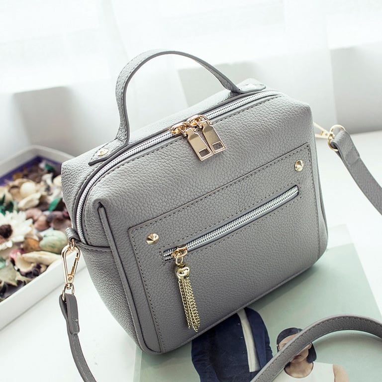 Women's small suitcase-shaped handbag. Handle for hand and long adjustable shoulder strap. Zip fastening. Front pocket with zip. Available in several colours.