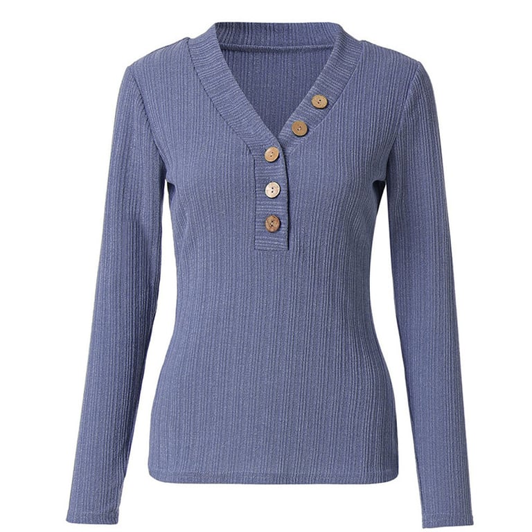 Comfortable t-shirt in a single colour with an attractive pattern. The striking V-neck is complemented by decorative buttons, and the entire cut features long sleeves. Suitable for autumn and winter wear.