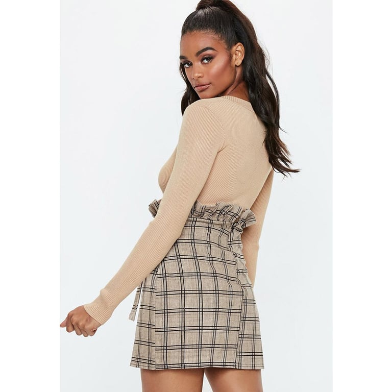 Short women's skirt with a high waist. The skirt features a checkered pattern and a tie belt at the waist.