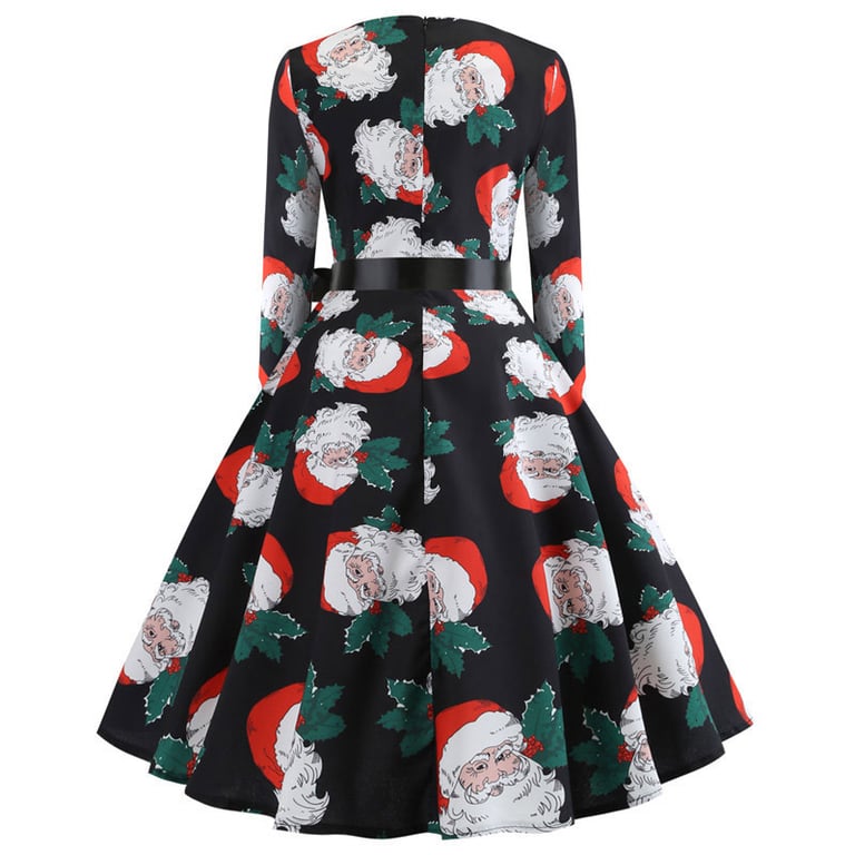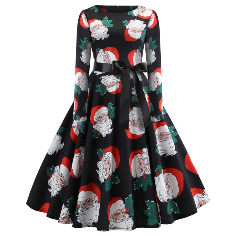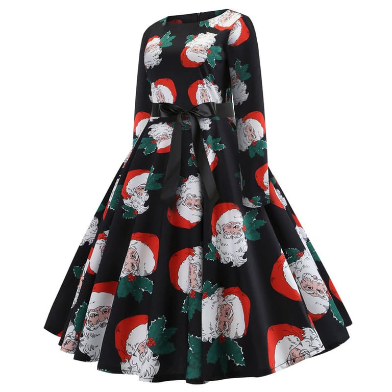 Women's dress with a Christmas pattern, long sleeves, and a round neckline. The dress features a wide skirt that reaches the knees and a tie at the waist. Available in various options.