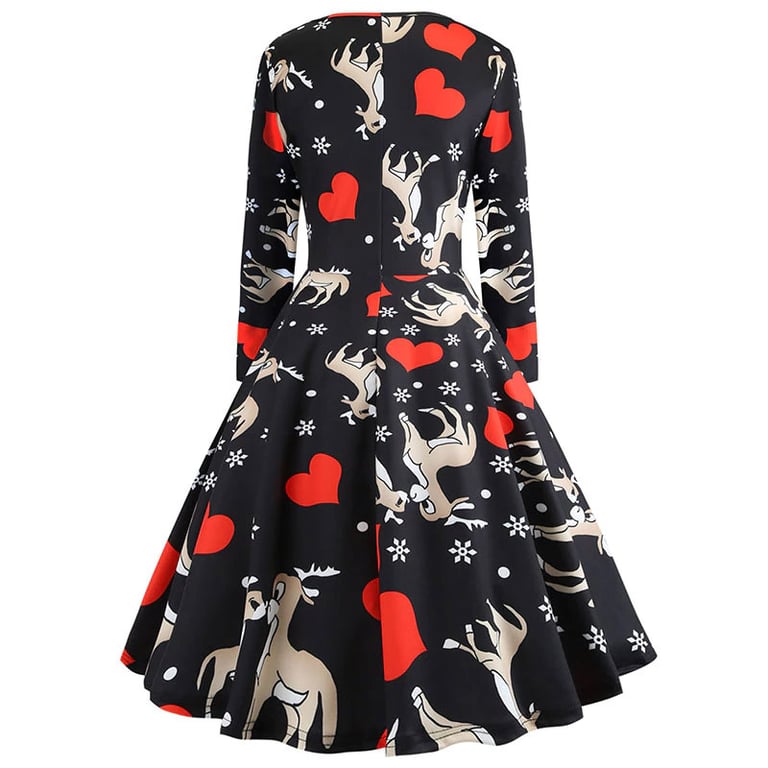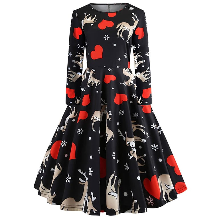 Women's dress with long sleeves and a Christmas pattern. The skirt is wide and knee-length. Available in various options.