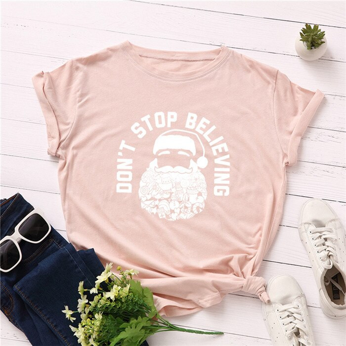Women's short-sleeved t-shirt with a round neckline. Christmas-themed print on the front. Loose fit. Available in multiple colour options.