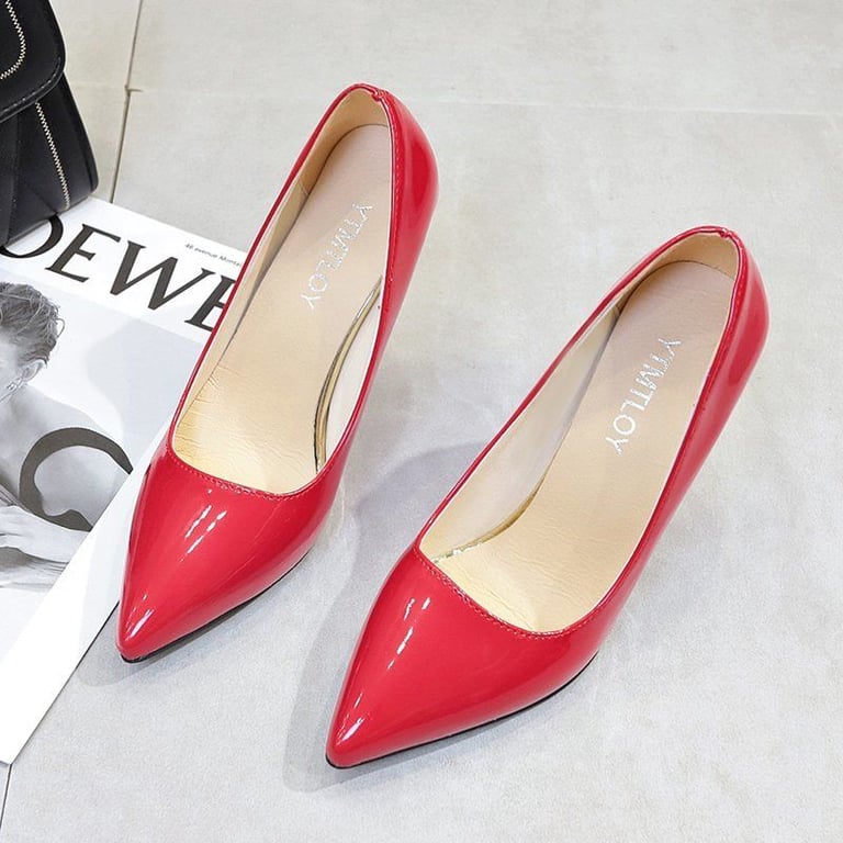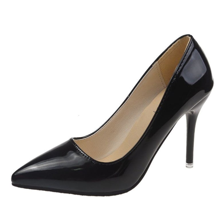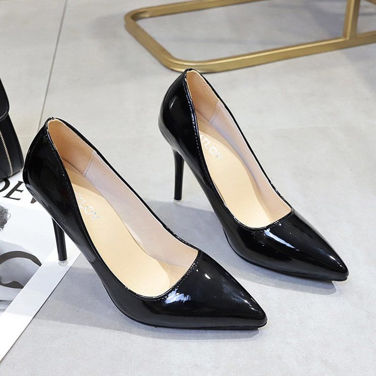 Beautiful pointed patent court shoes with stiletto heels.