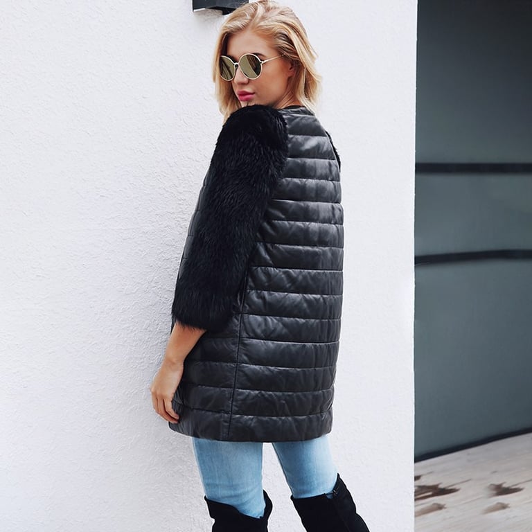 Women's winter quilted jacket in a loose fit. The jacket features a zip fastening, two side zip pockets, and the sleeves are made of faux fur.