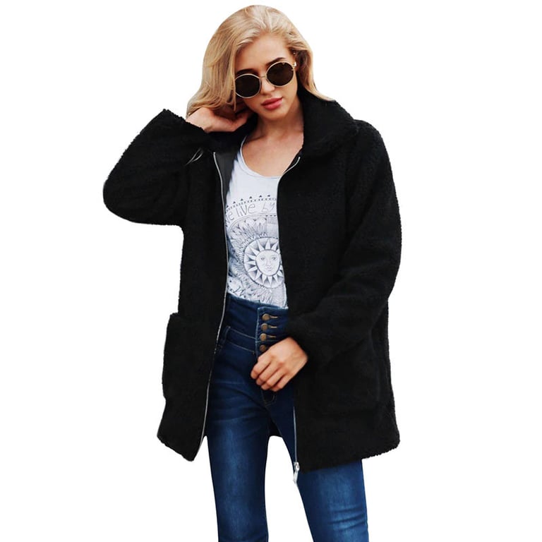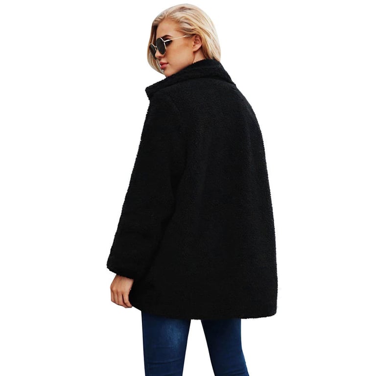 Women's warm fur coat with a collar and zip fastening. The coat has a loose fit and features two side pockets. Available in several colour options.