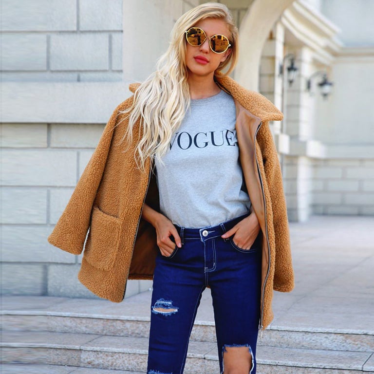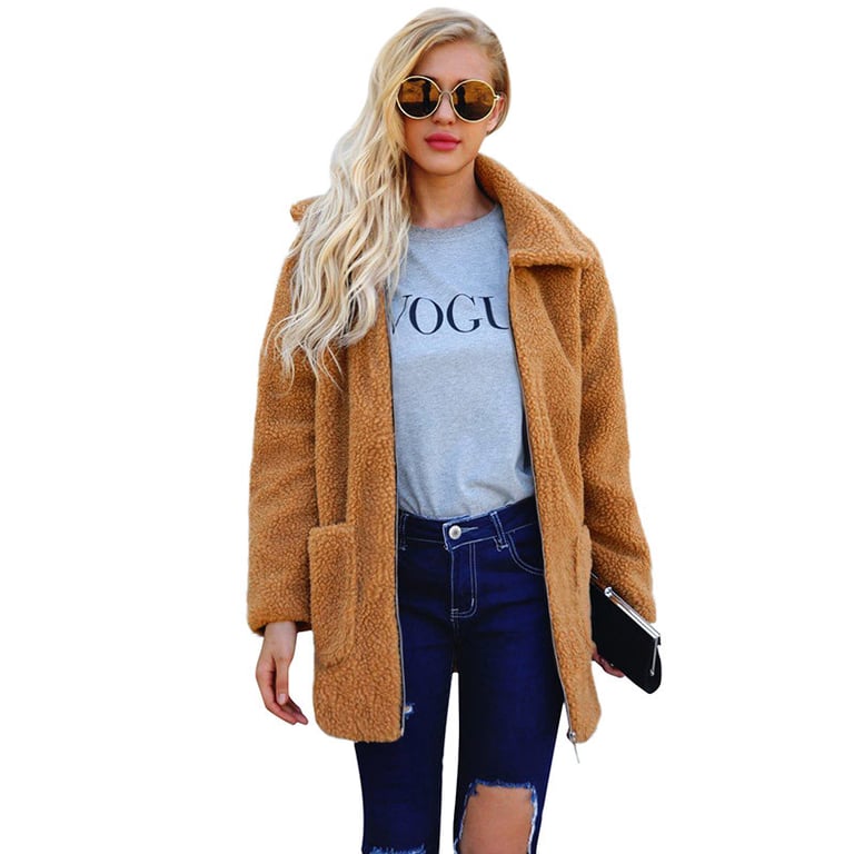 Women's warm fur coat with a collar and zip fastening. The coat has a loose fit and features two side pockets. Available in several colour options.