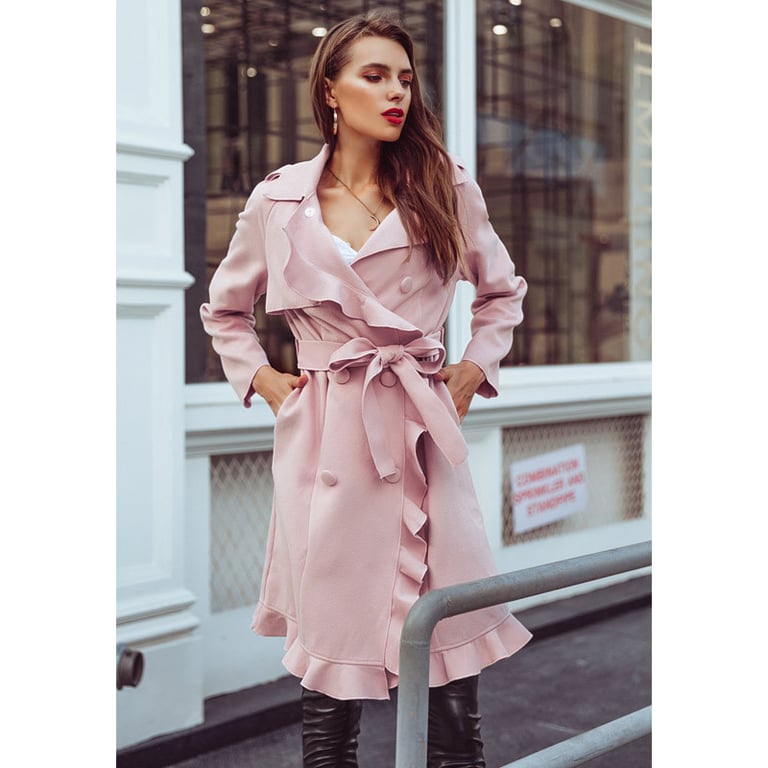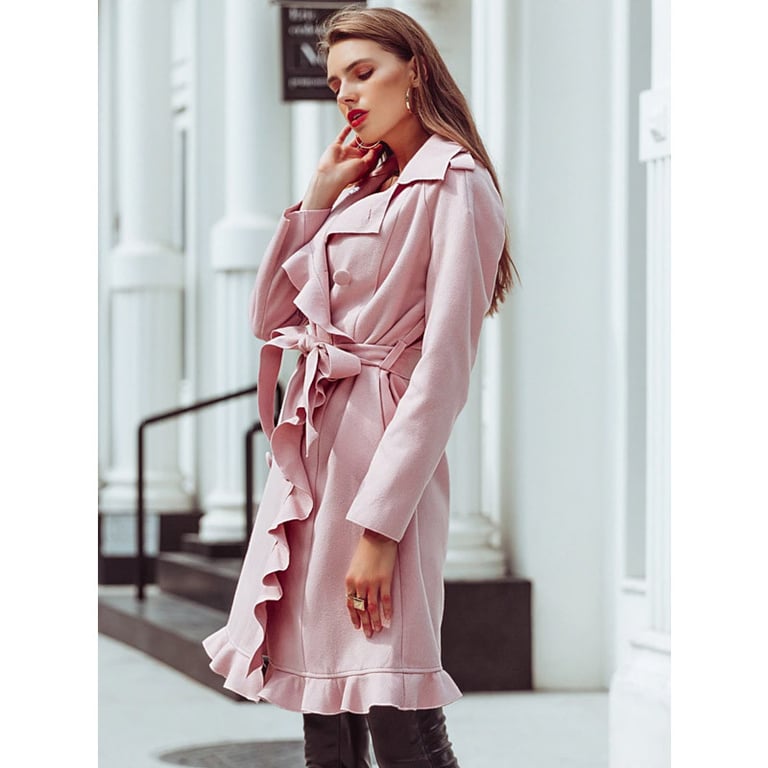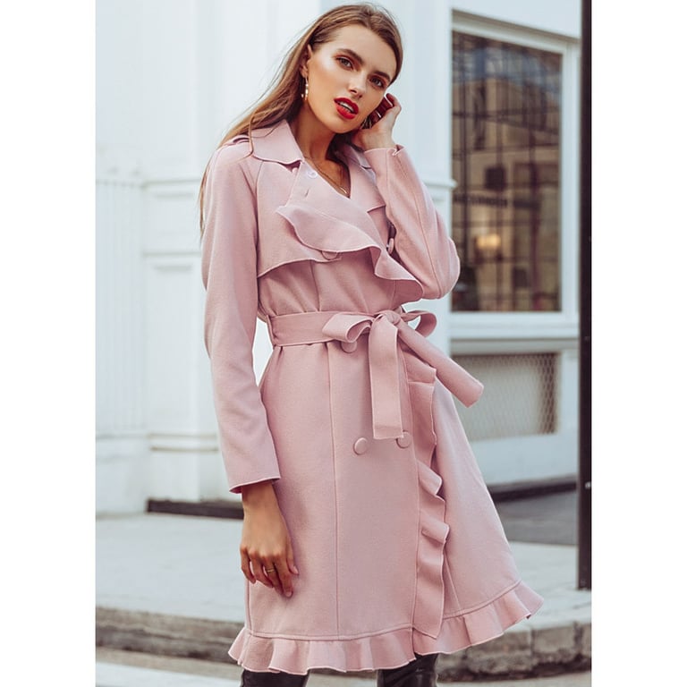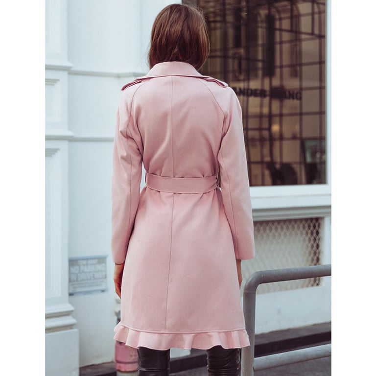 Women's autumn coat with lapels. Long, straight cut with a tie belt at the waist and button fastening.