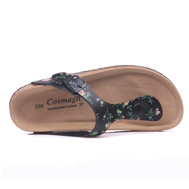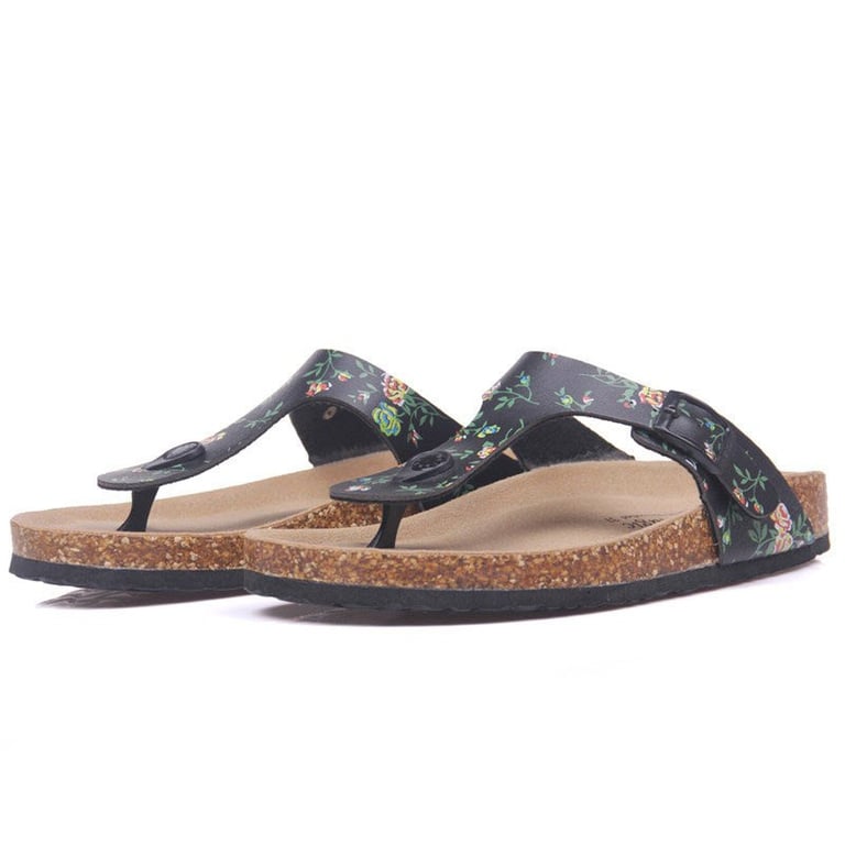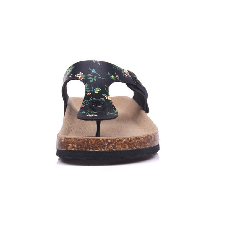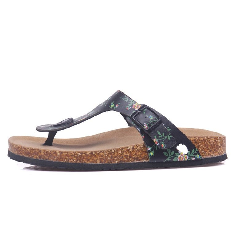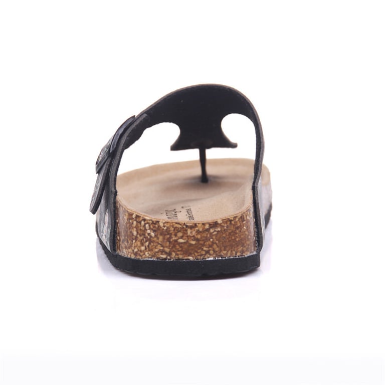 Women's slippers with a cork health sole. Adjustable strap with a leather-like appearance and metal buckle. Anatomically shaped insole. EVA sole. Available in multiple colour options.