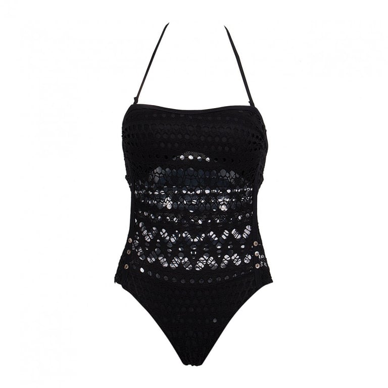 Women's crocheted swimsuit in black. Narrow straps with a tie at the neck. Padded cups.