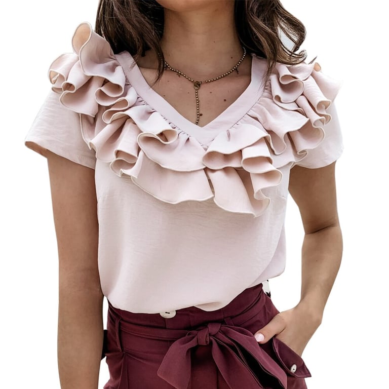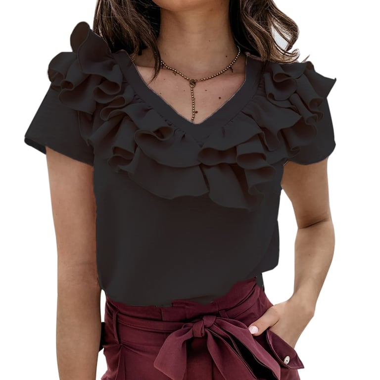You'll appreciate this comfortable piece for any occasion. It has short sleeves and a ruffle around the neckline adds to its cuteness.
