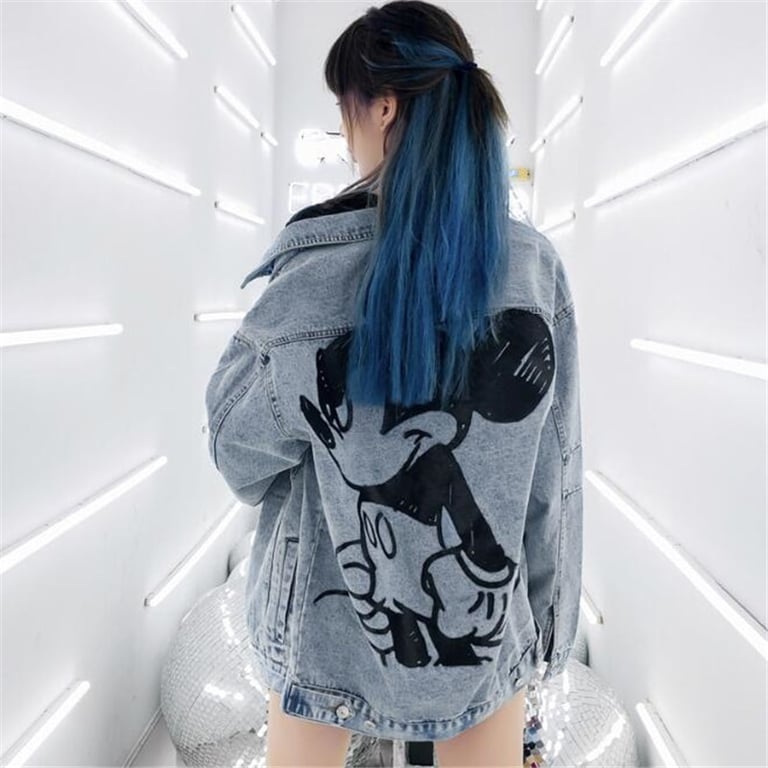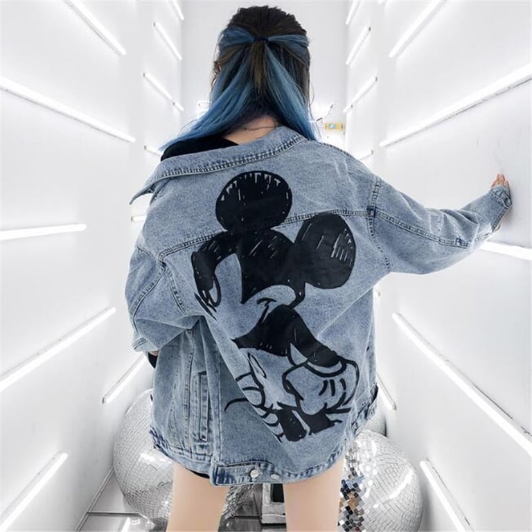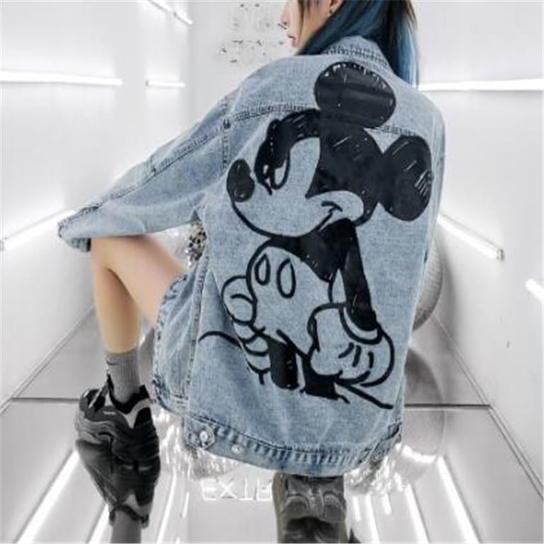 • A women's denim jacket featuring a decorative Mickey Mouse motif is a must-have in your wardrobe!