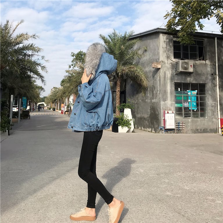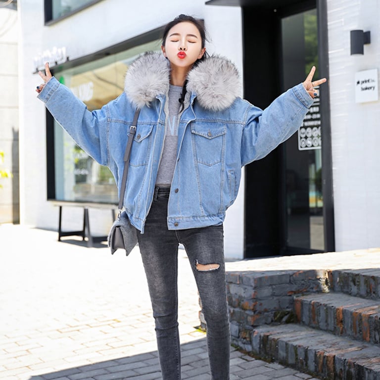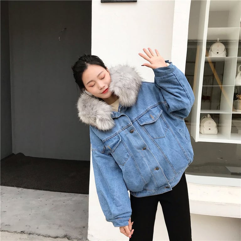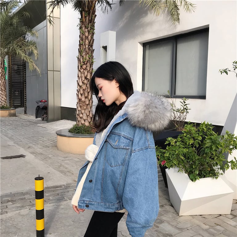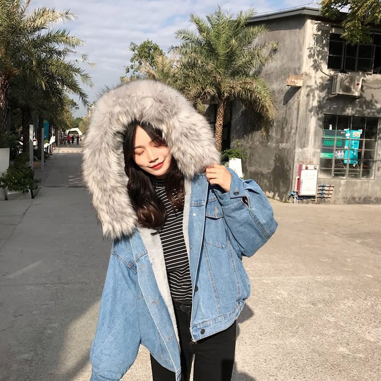 Women's oversized denim jacket with a hood and large faux fur. The jacket features button fastening, two side pockets, and two chest pockets. It is lined with insulated faux fur on the inside. Available in three colour options.