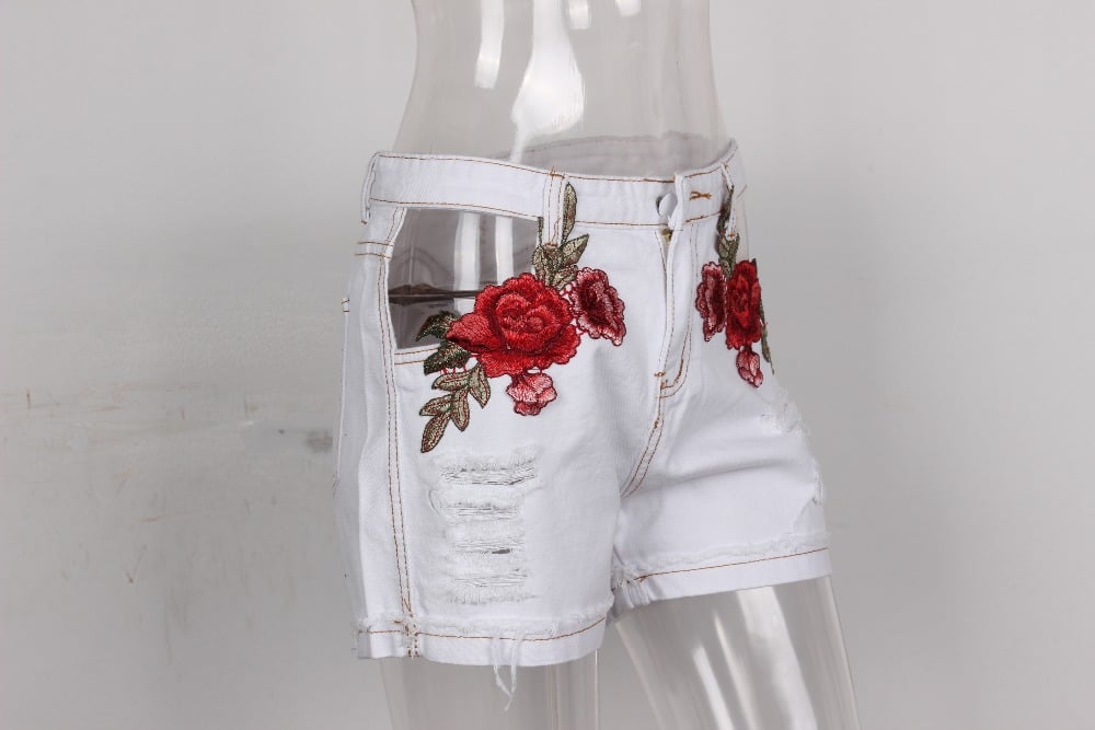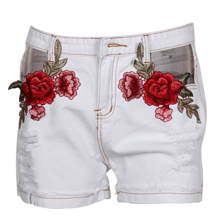 Enjoy beautiful, sunny days with these shorts featuring roses on the sides instead of pockets.