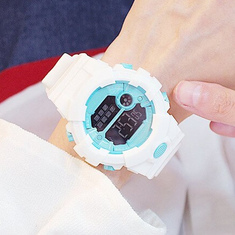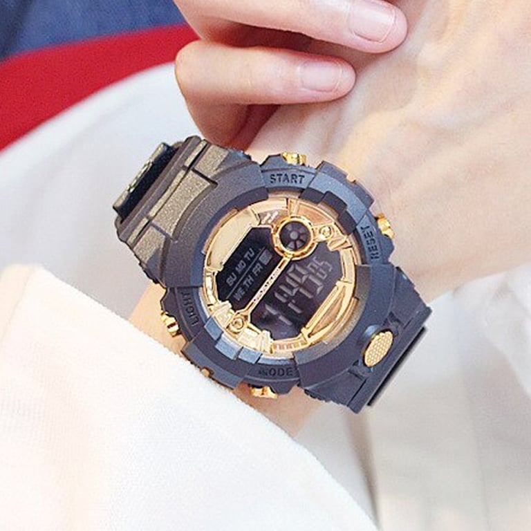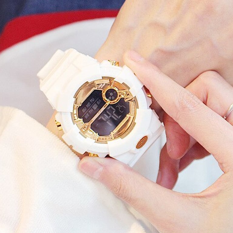 Elegant women's watch with digital time display.