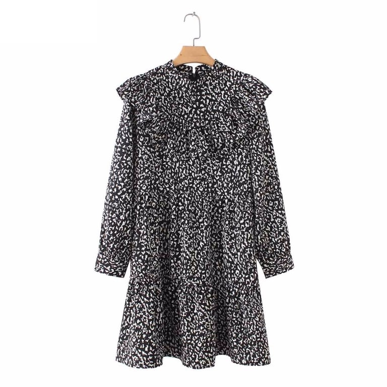 Decorative ruffle and contrasting print.
