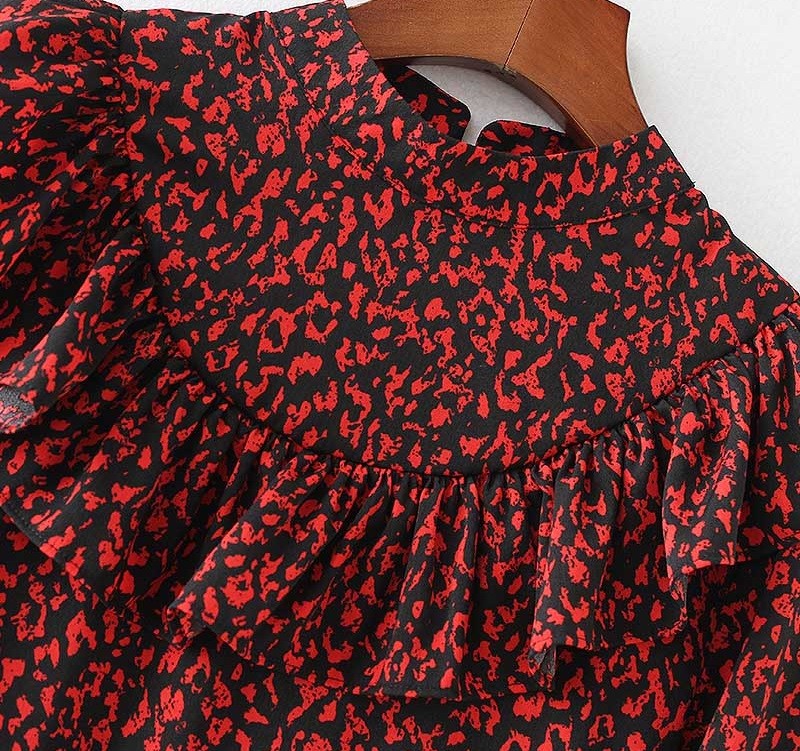 Decorative ruffle and contrasting print.