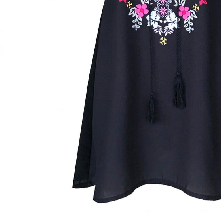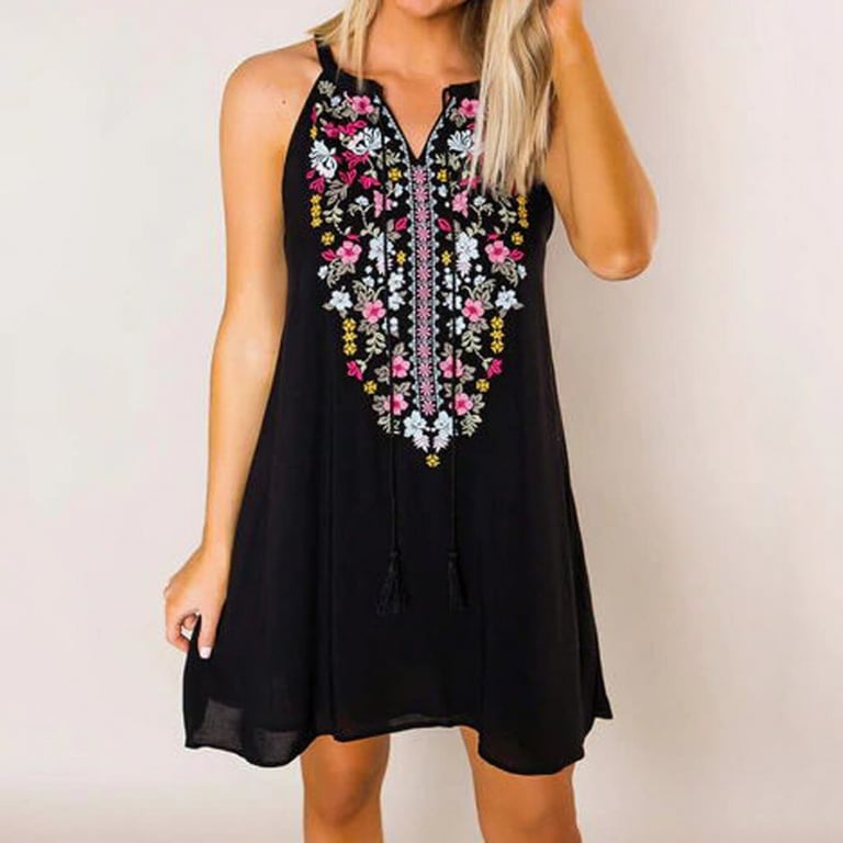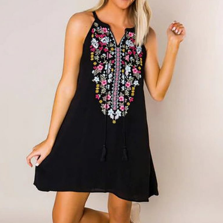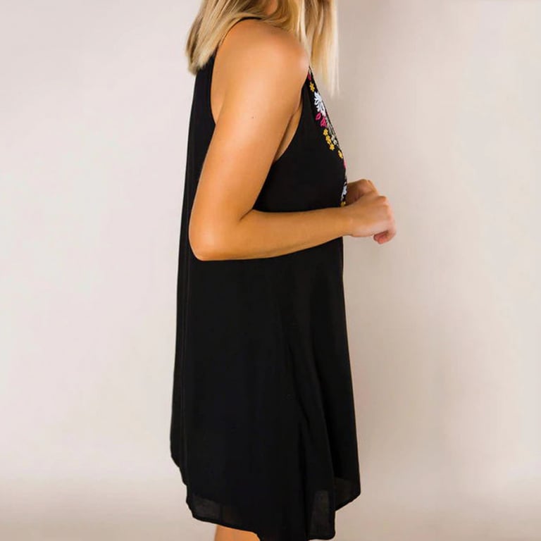 Women's summer dress with thin straps. Short loose fit. Neckline decorated with embroidered flowers.