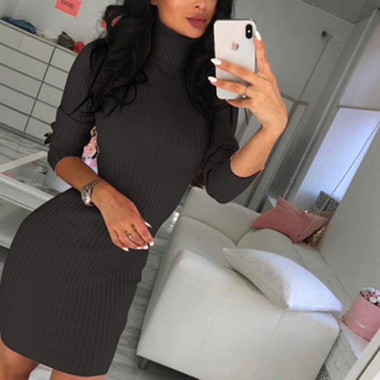 Women's elegant ribbed dress with a turtleneck. The dress is short in length and has long sleeves. Available in three colour options – grey, black, and pink.