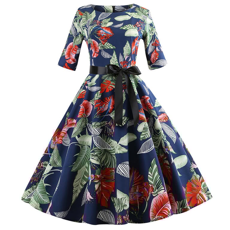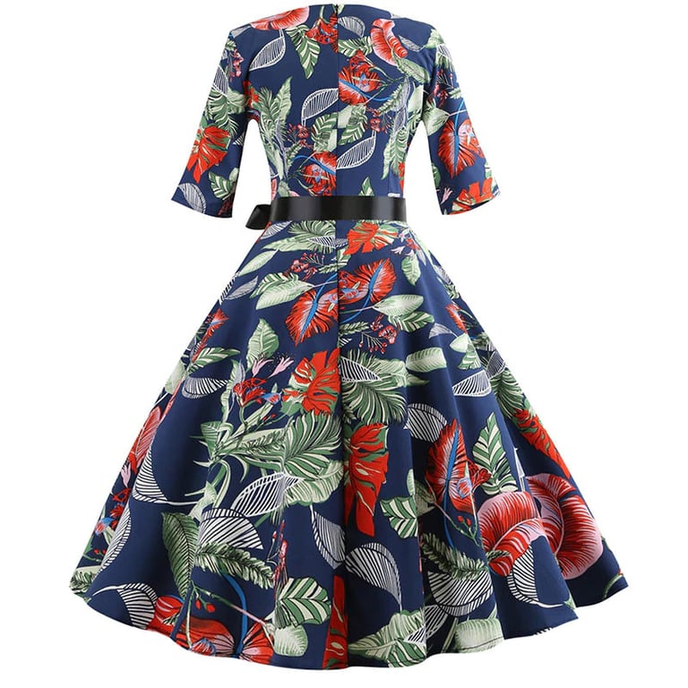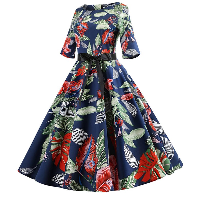 Women's dress with 3/4 sleeves and a round neckline. The skirt is wide, knee-length, and features a tie at the waist. Available in four variants.
