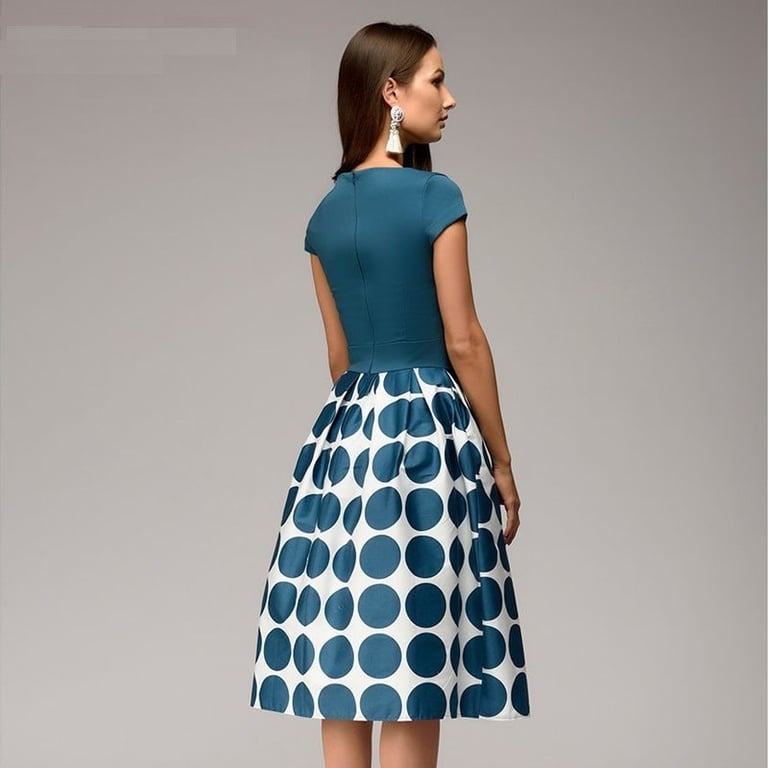 Elegant dress with a round neckline and short sleeves.